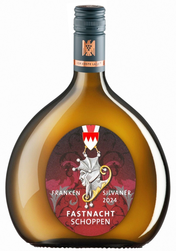 Der Fastnacht-Schoppen, dessen Bocksbeutel-Flasche einen trockenen Silvaner vom Randersackerer Marsberg in Unterfranken enthält, soll Werbung machen für die fränkische Fastnacht. In der Vinothek des Staatlichen Hofkellers in Würzburg und bei uns im Onlineshop zu kaufen.